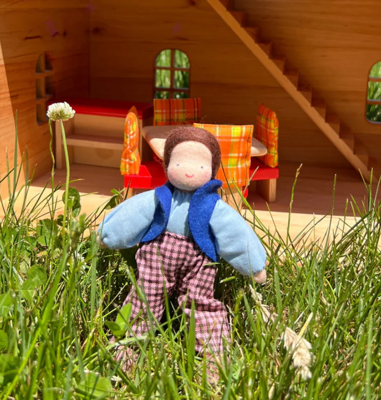 Evi dolls are handcrafted in Brazil with the finest natural materials and close attention to detail. These Waldorf dolls are filled and nicely padded with pure soft wool, have all-cotton skin, hair of soft wool, mohair, or cotton, and cotton clothing.